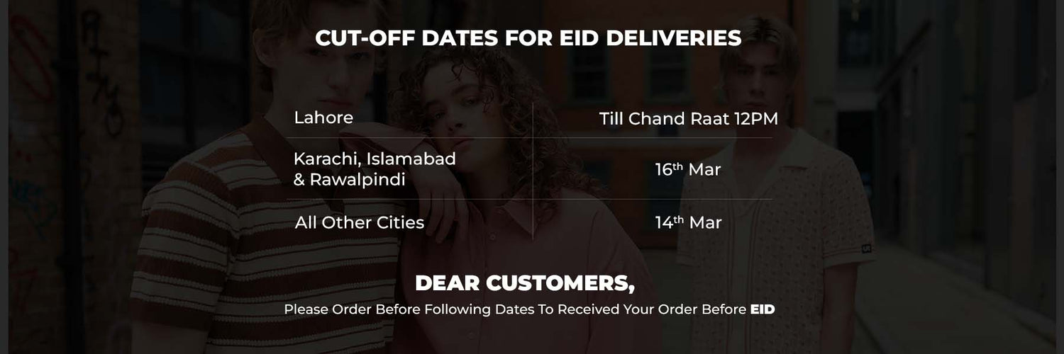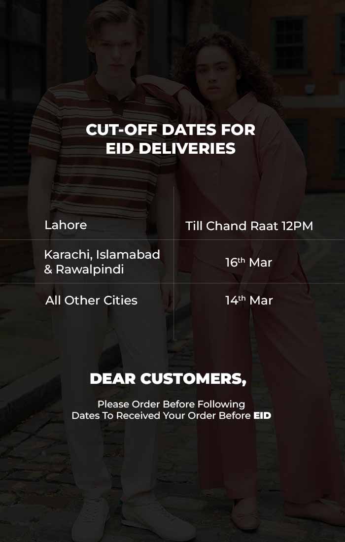 Last day to place Eid orders is 16th March. Orders placed after 16th March will be delivered after Eid. (Except Lahore)