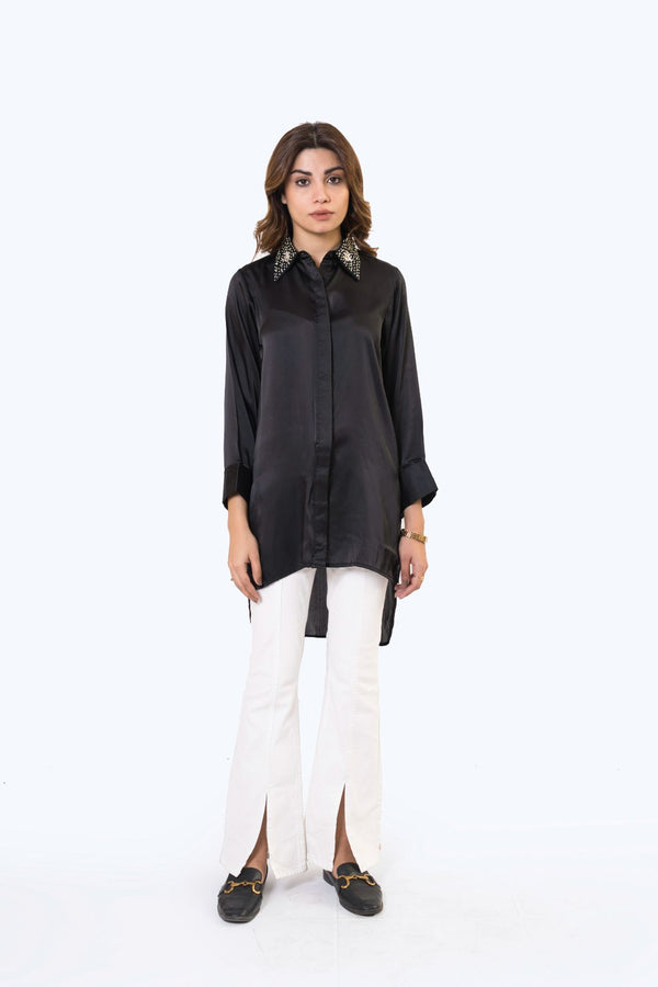 This Skin Long Shirt is made of lightweight crepe fabric, creating a dashing black texture. With high breathability and wrinkle resistance, it's perfect for your everyday wear.