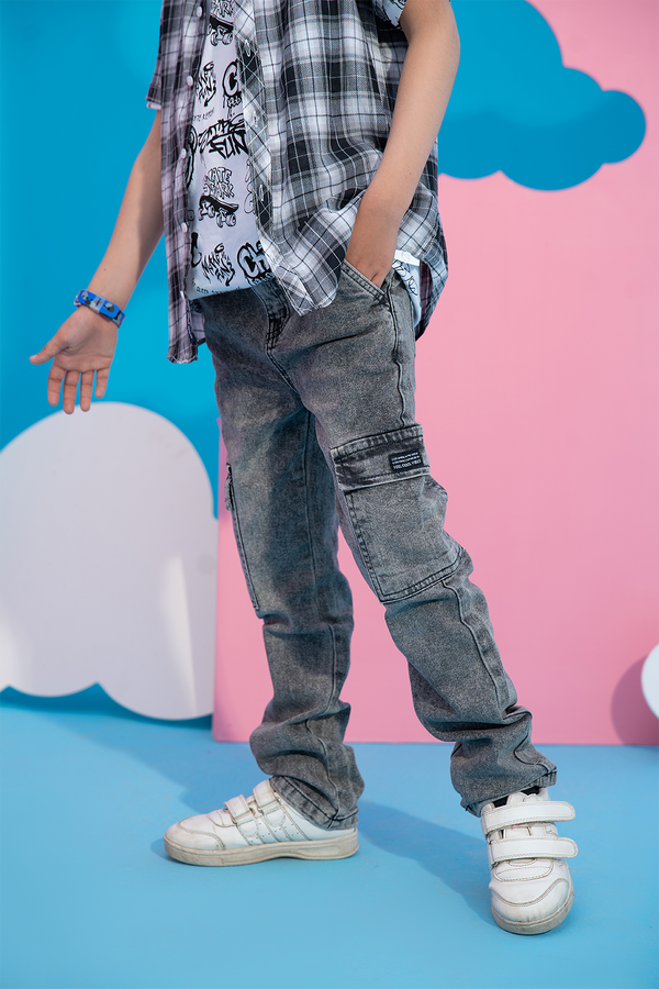 Expertly crafted cargo pants featuring durable denim construction for exceptional longevity. Designed with functional pockets and reinforced stitching, these versatile bottoms offer both practicality and style for active boys. The...