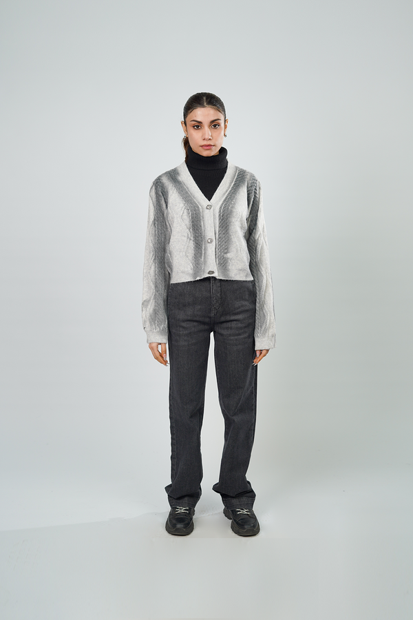 A front-open long cardigan made from acrylic sweater fabric, featuring large front patch pockets. Its soft texture and relaxed silhouette make it perfect for cozy, effortless layering. The model is...