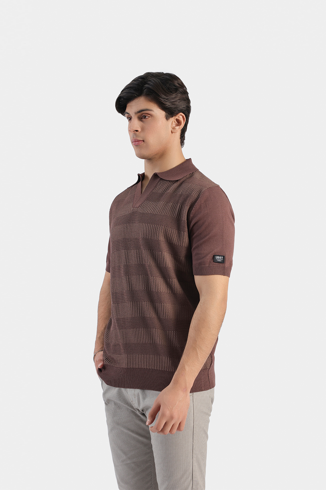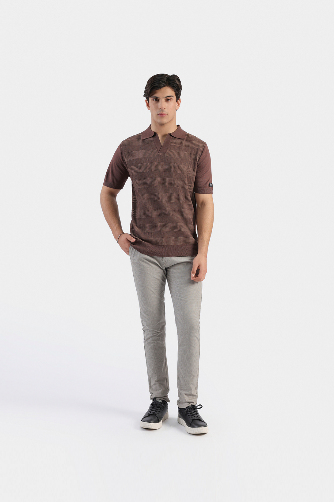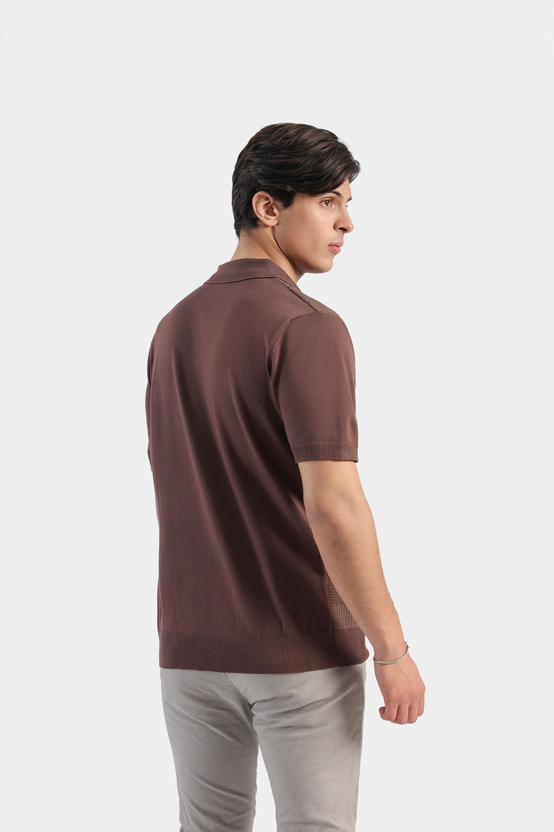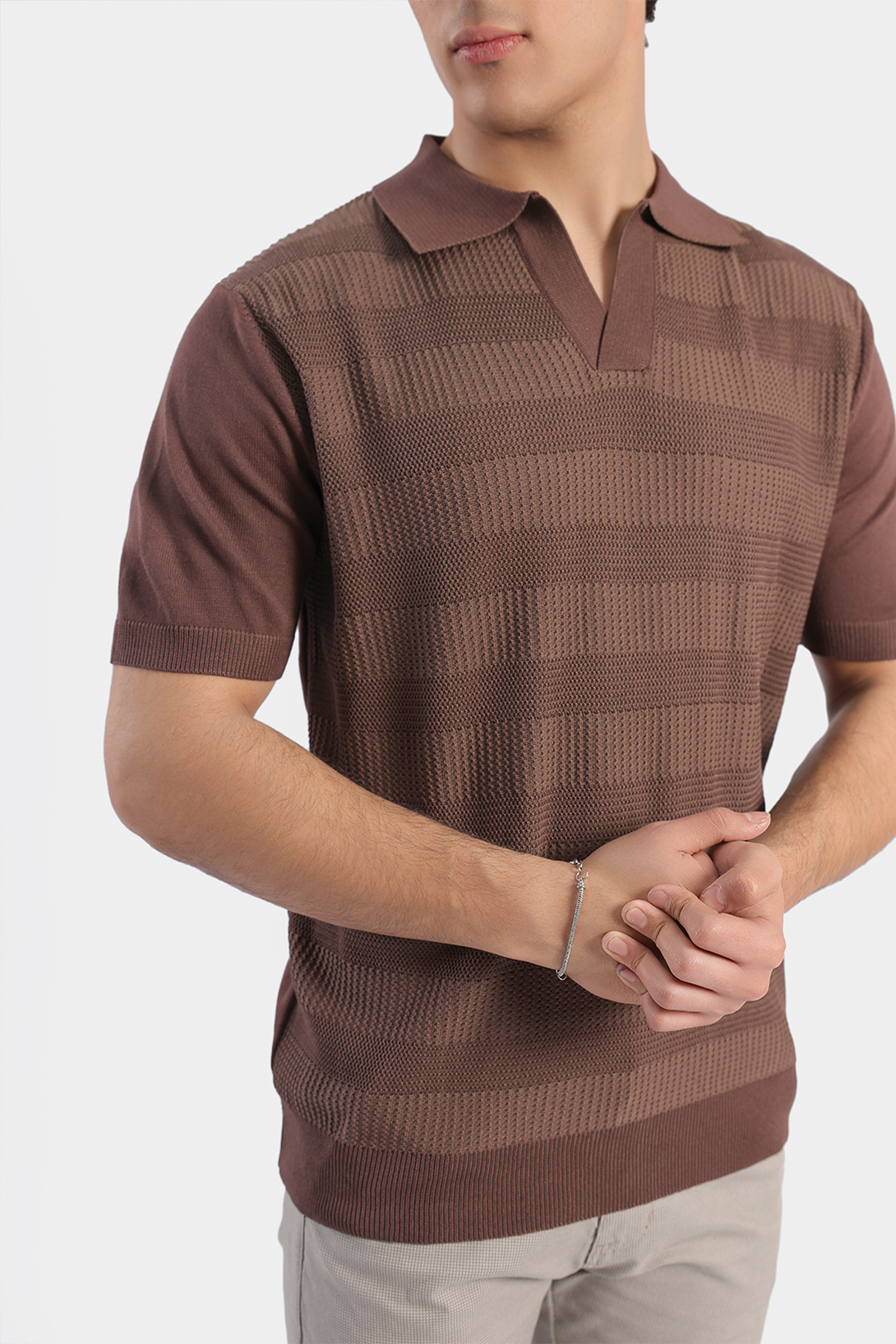 Made with 100% premium mercerized cotton. It features self design, Johnny collar, ribbed cuffs and hem. This polo exudes timeless elegance and is a must-have for any fashion-forward wardrobe.