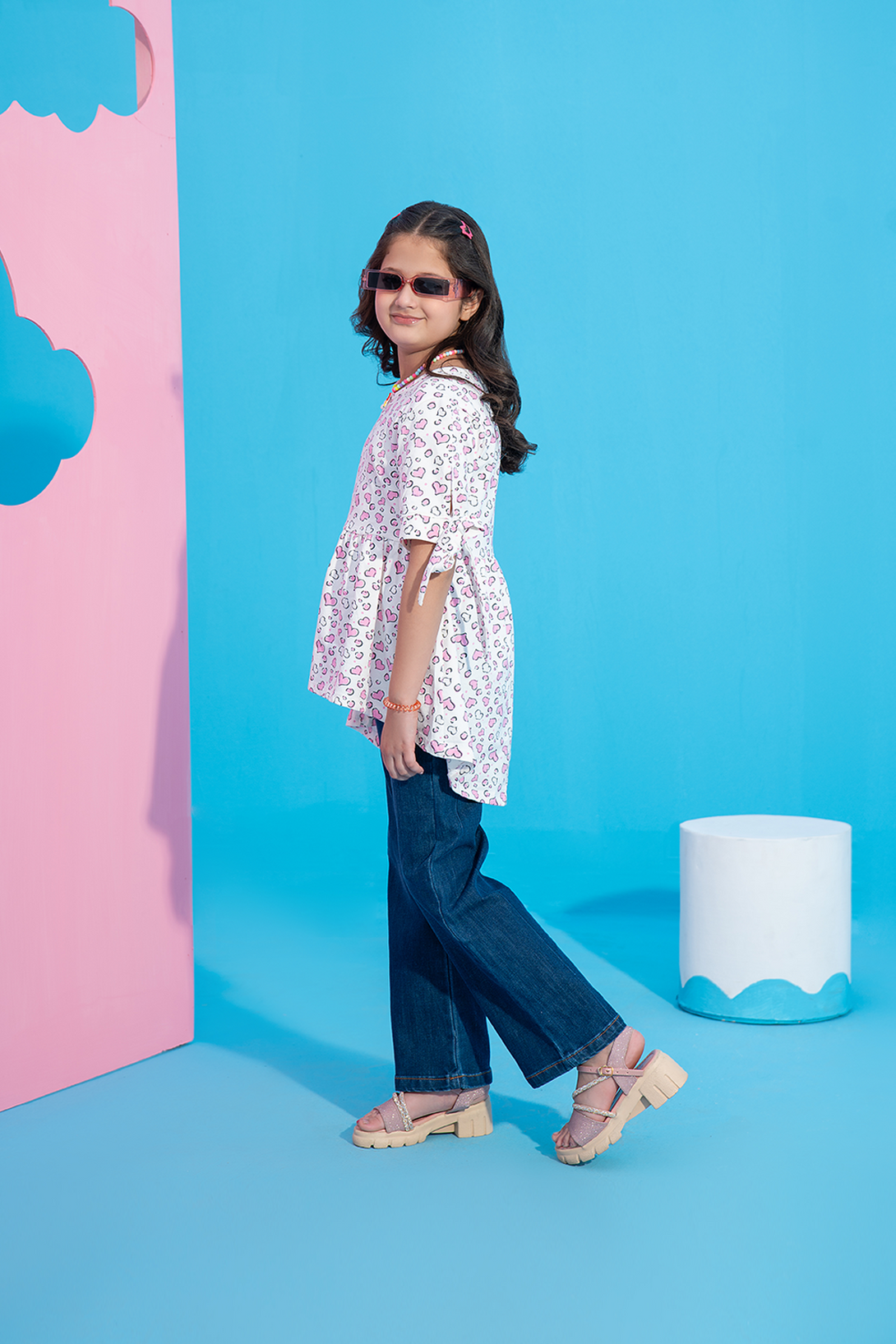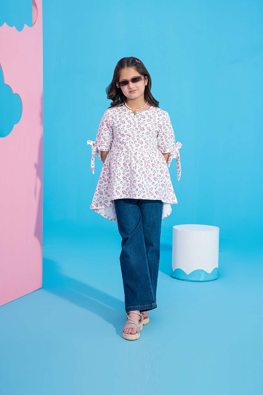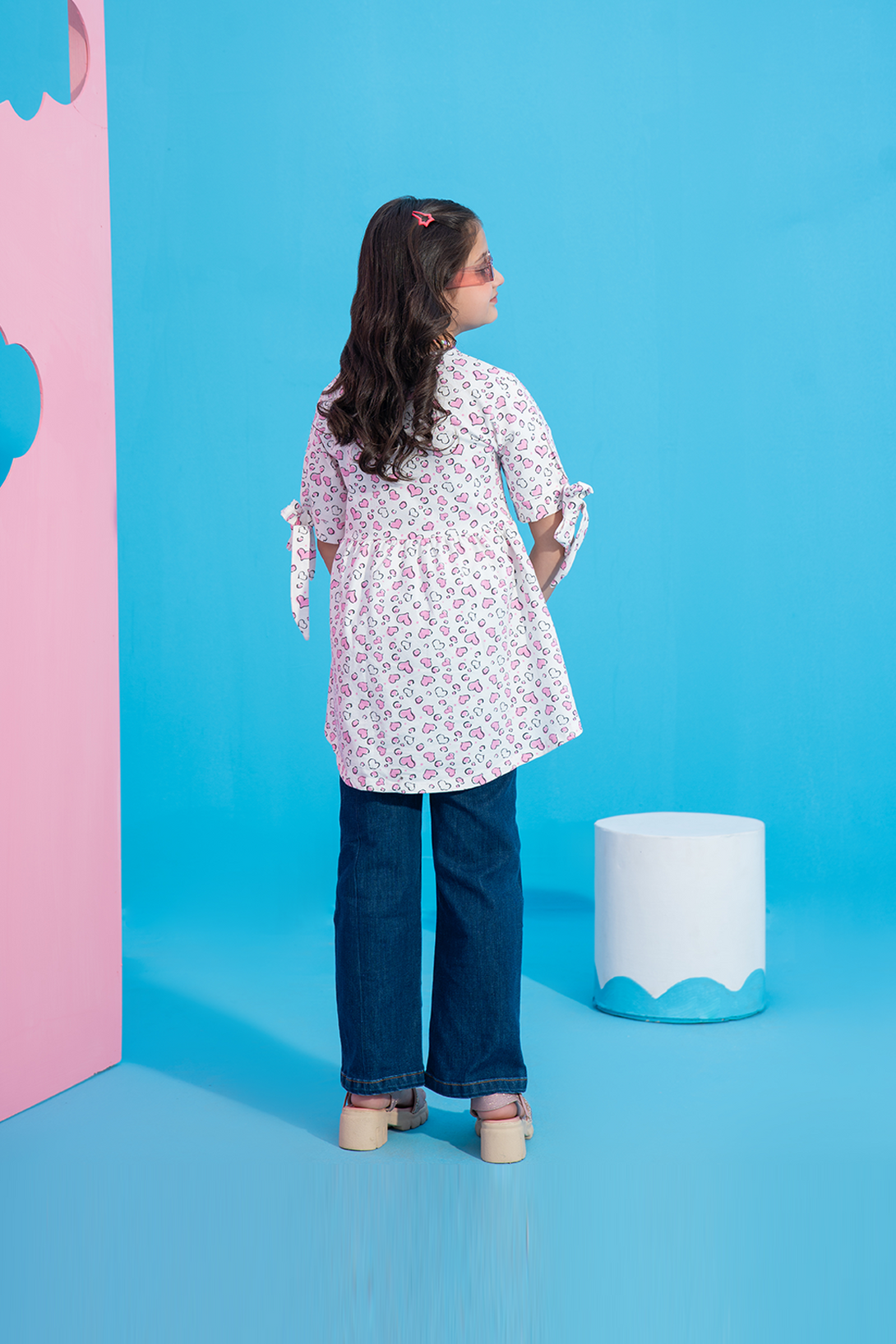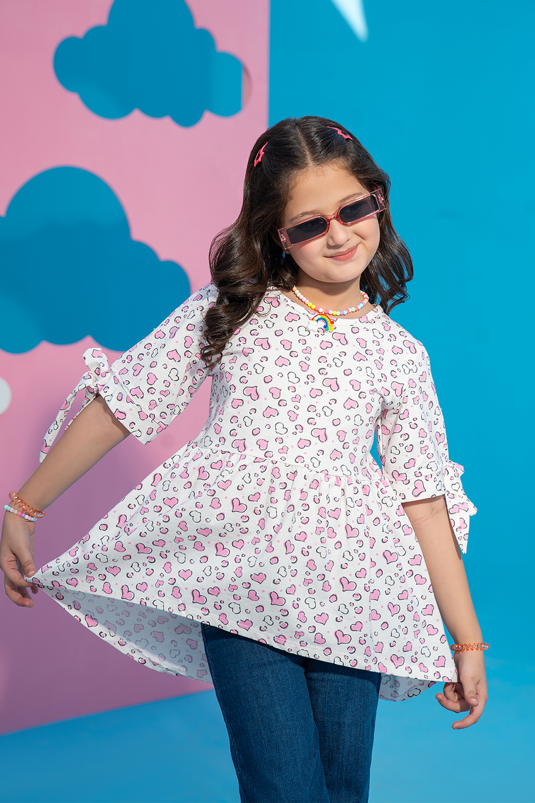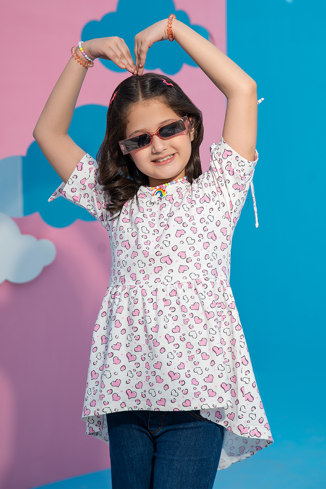This charming Girls' Printed Flared Top features a cute all-over hearts print and a playful bow detail at the sleeves. The flared silhouette adds a fun, flowy look, making it perfect for everyday wear. Stylish and comfortable, this top is ideal for any casual outing or playdate.