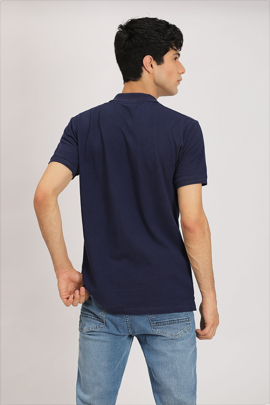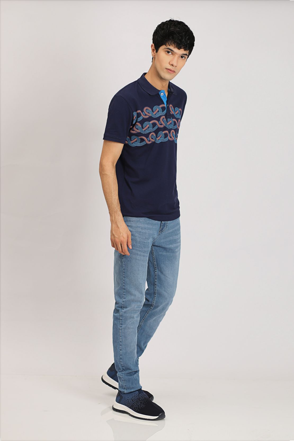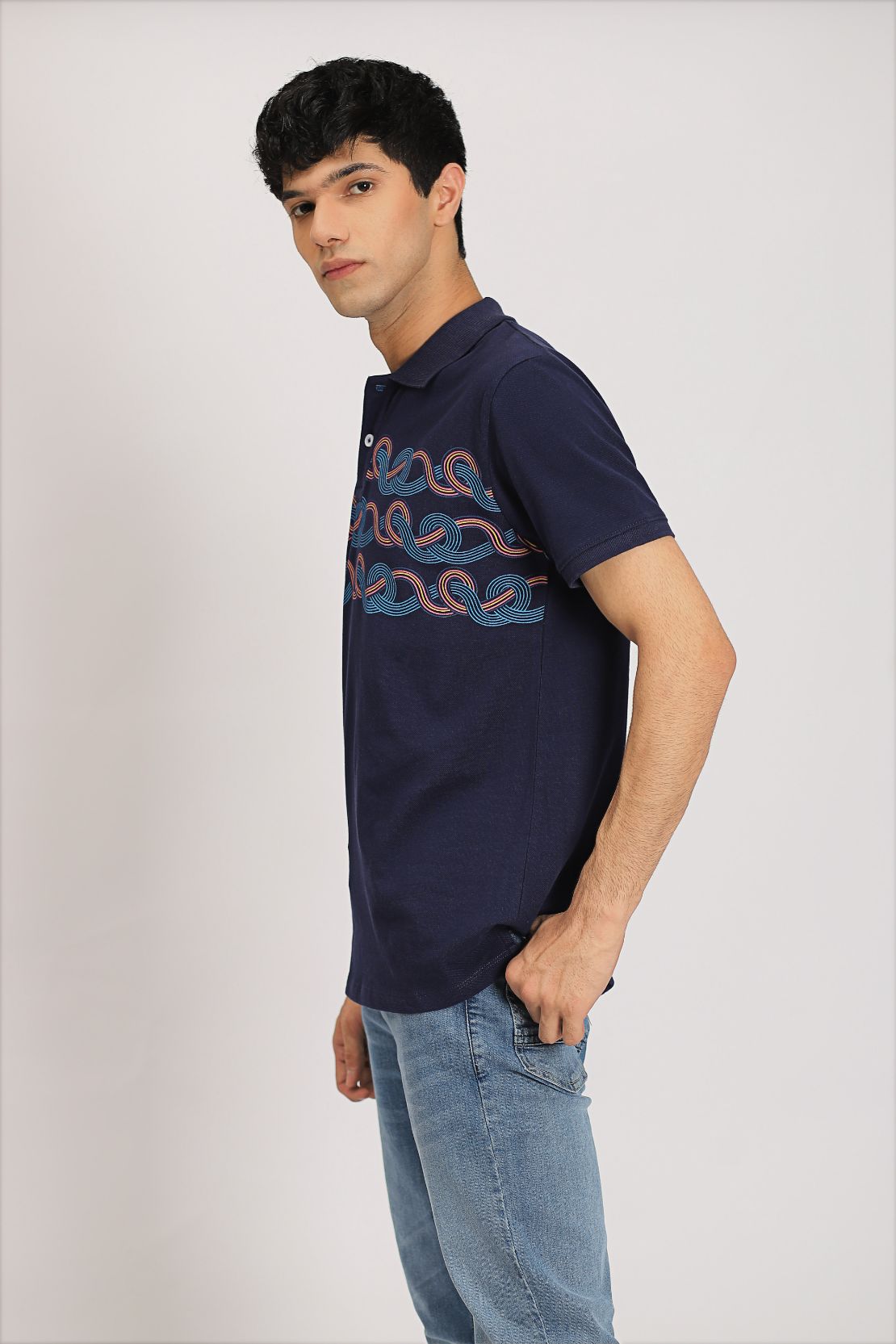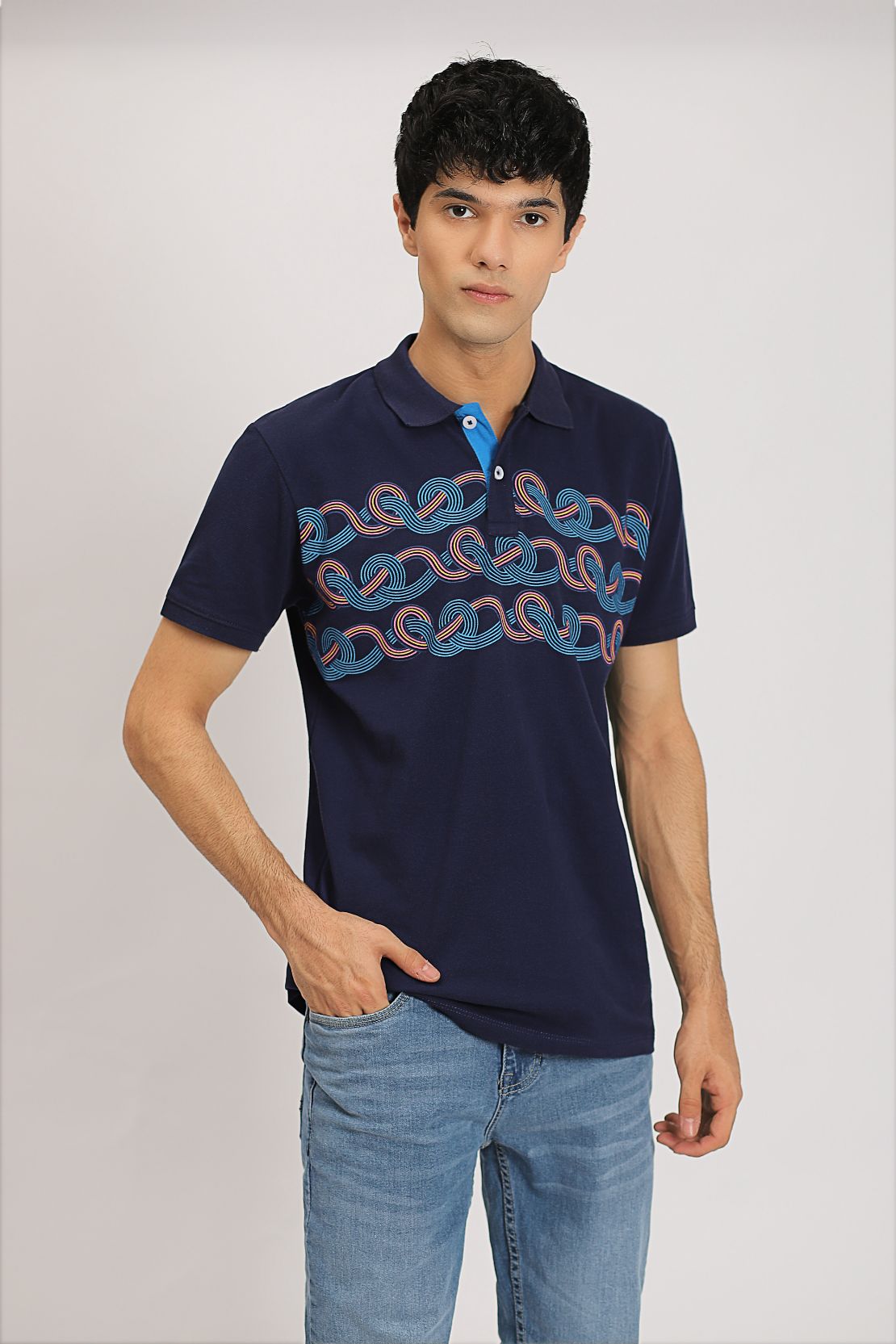 Look your best in this stylish navy polo shirt with a graphic Rob design. Constructed from a comfortable and breathable pique cotton fabric, this shirt is ideal for the outdoors. Enjoy an unbeatable combination of comfort and style with this classic piece.