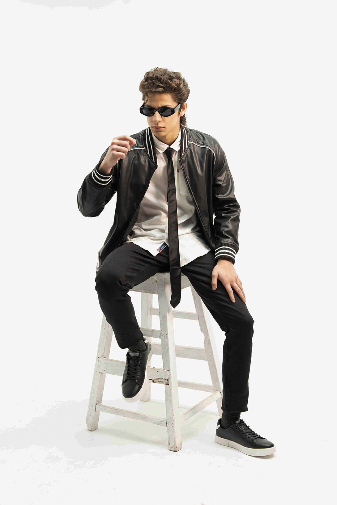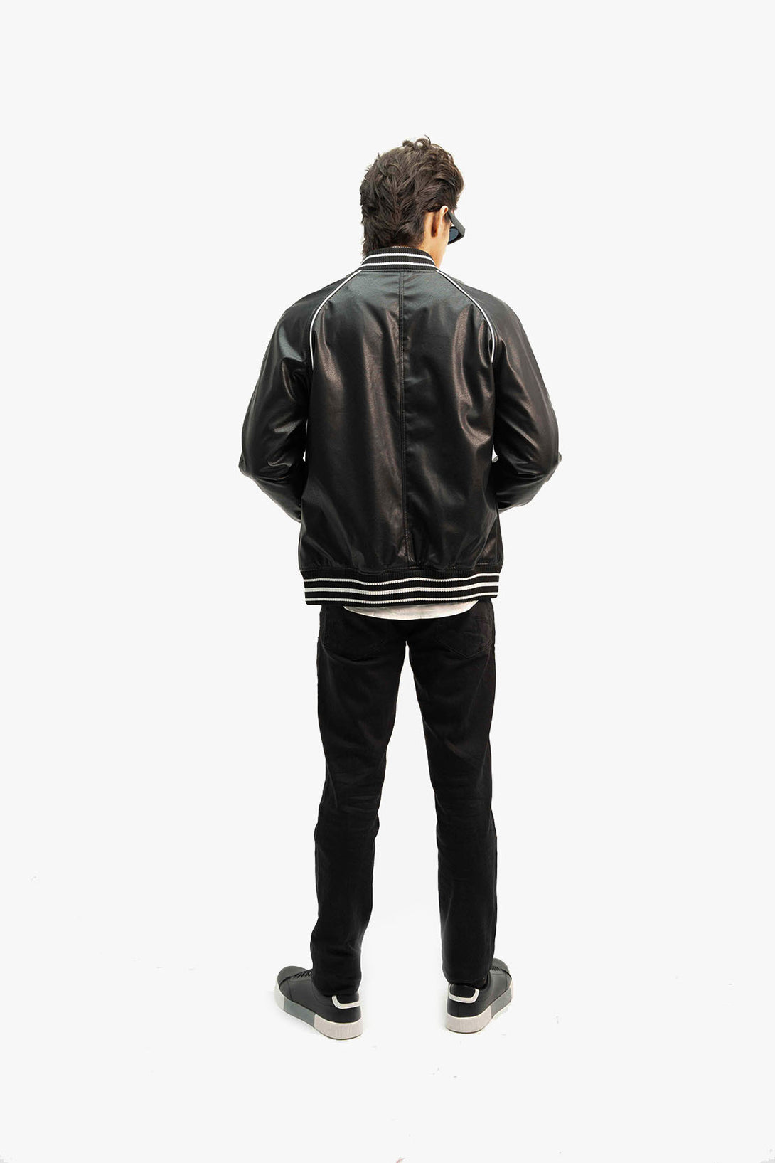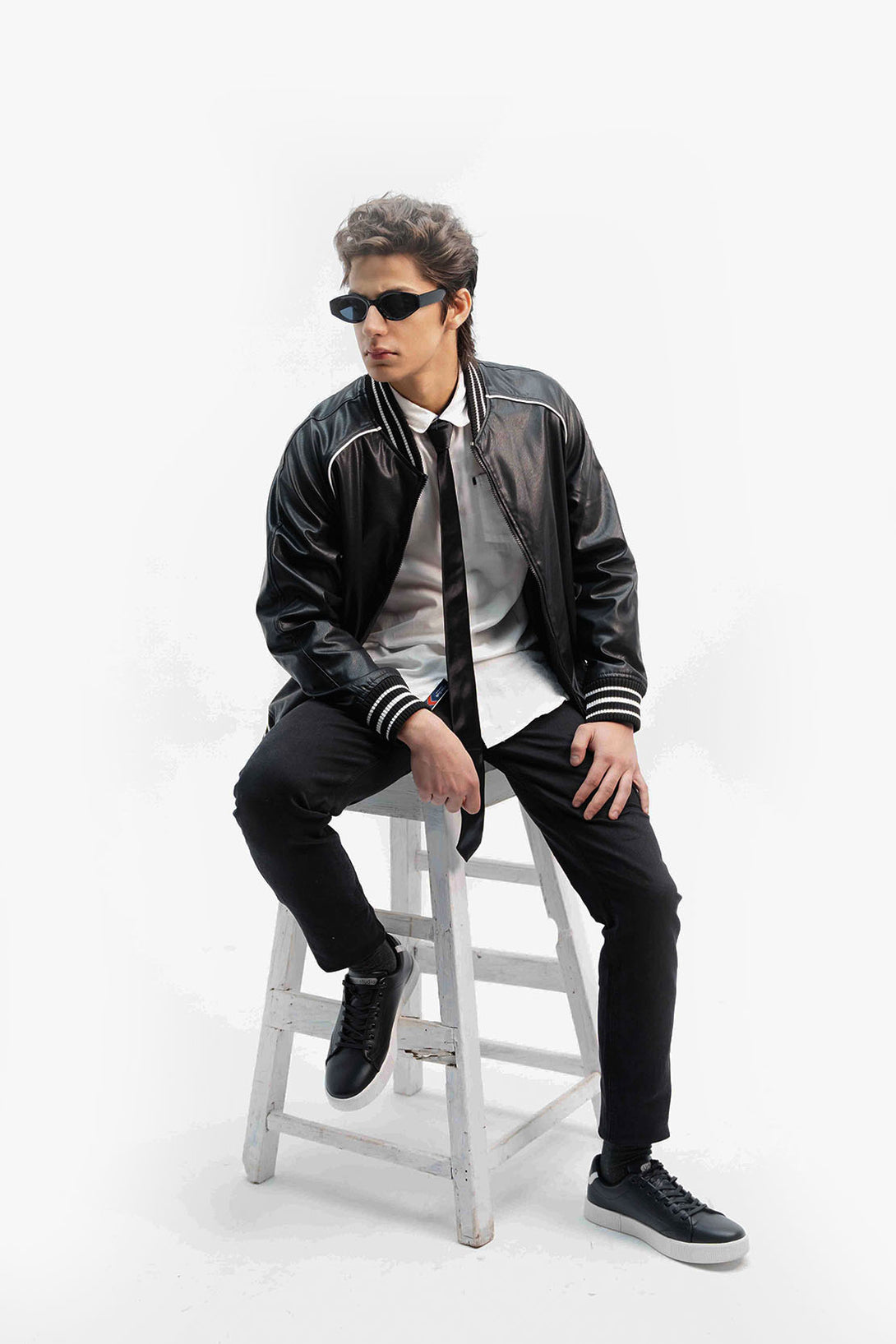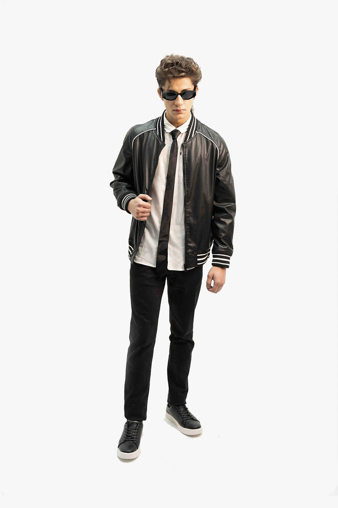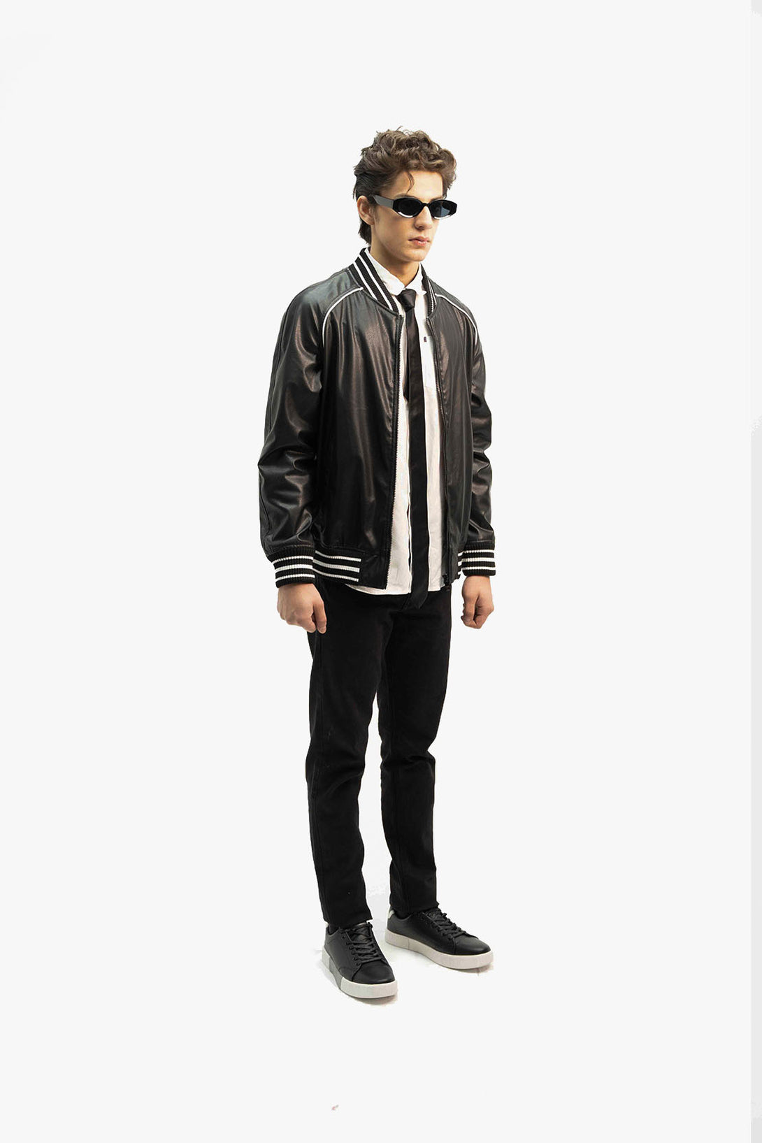 This stylish bomber jacket is crafted with durable faux leather that looks and feels just like the real thing. The chic design features a classic, timeless silhouette that will never go out of style.