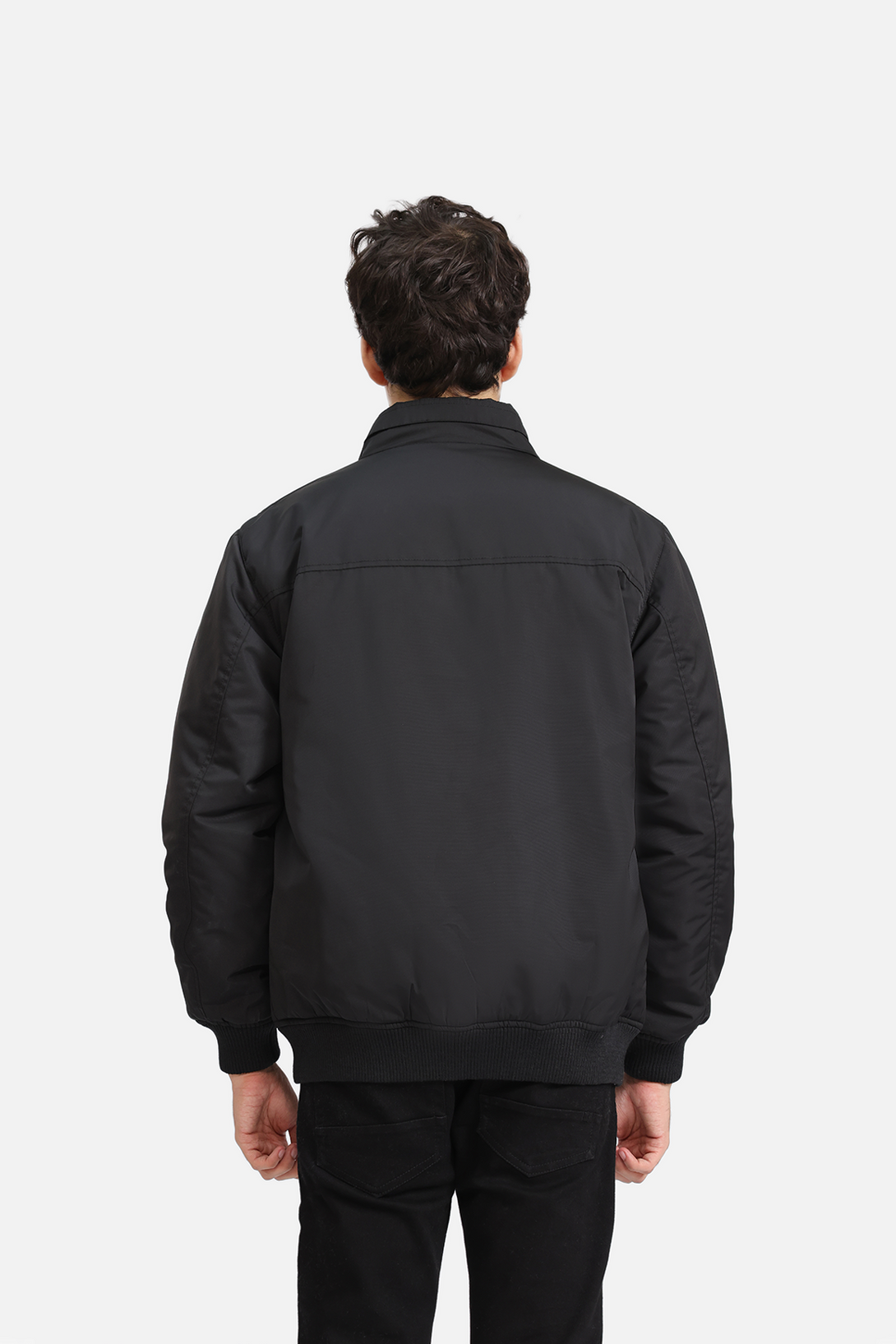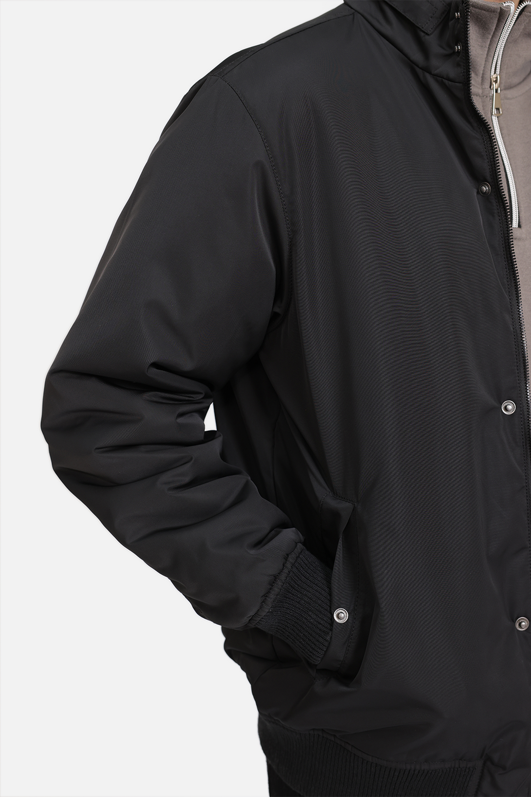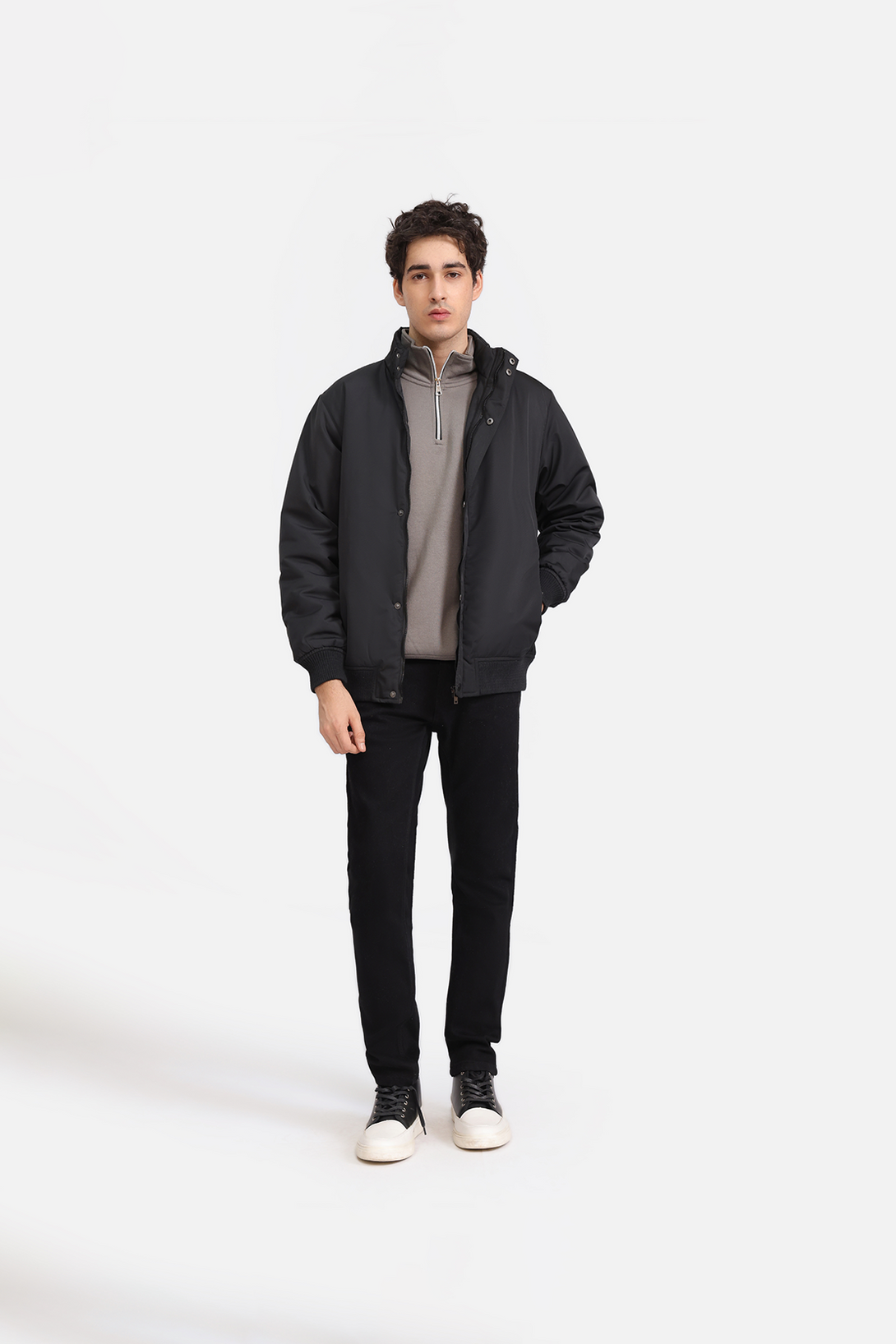 A modern bomber jacket designed with a sleek stand collar, it features long sleeves, a front zip and button closure, and a clean, structured silhouette. A versatile outerwear staple that blends comfort with contemporary style.