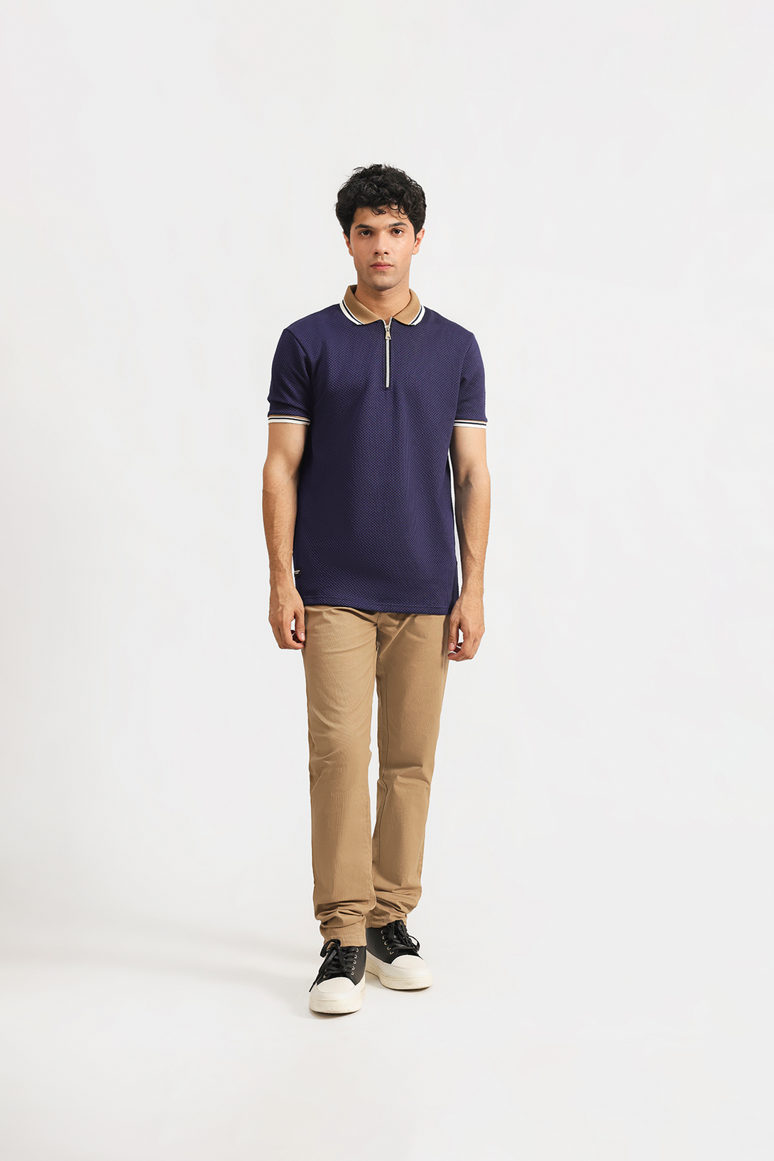 Crafted from rich jacquard fabric, this zipper polo showcases a refined textured pattern for a premium look. Featuring a contrast collar and tipping detail, it blends classic sophistication with modern style. The zip-up neckline adds a sleek finish, making it ideal for smart-casual occasions.