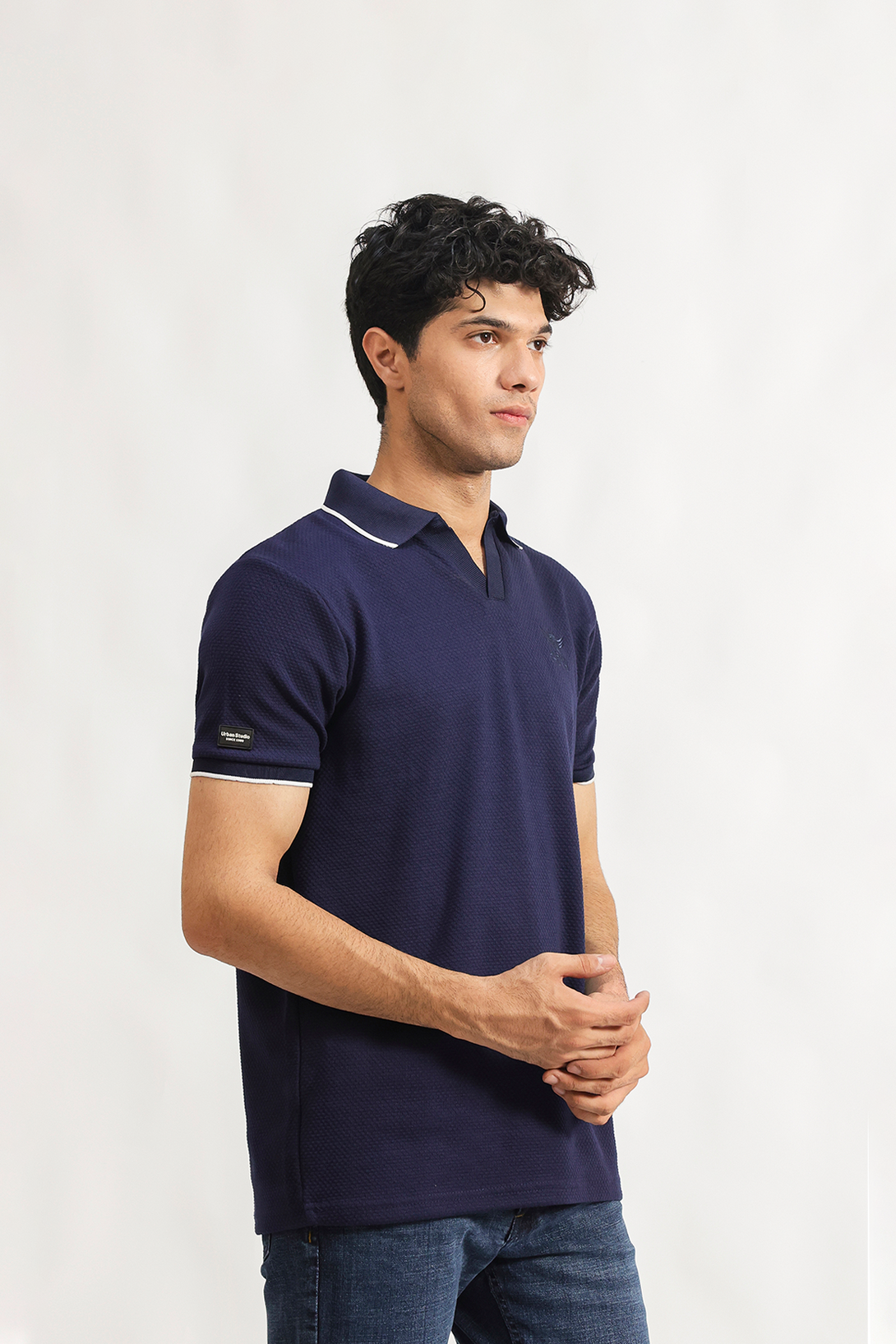 and breathable comfort. The design features contrast tipping at the collar and sleeves,