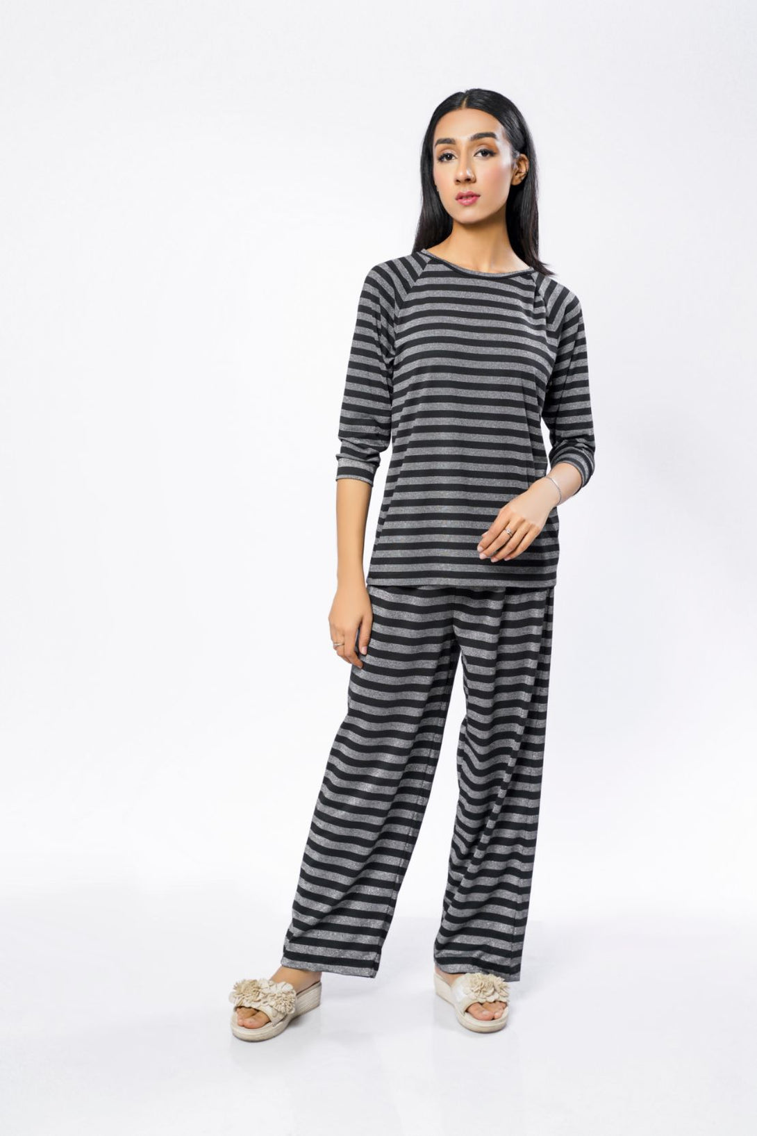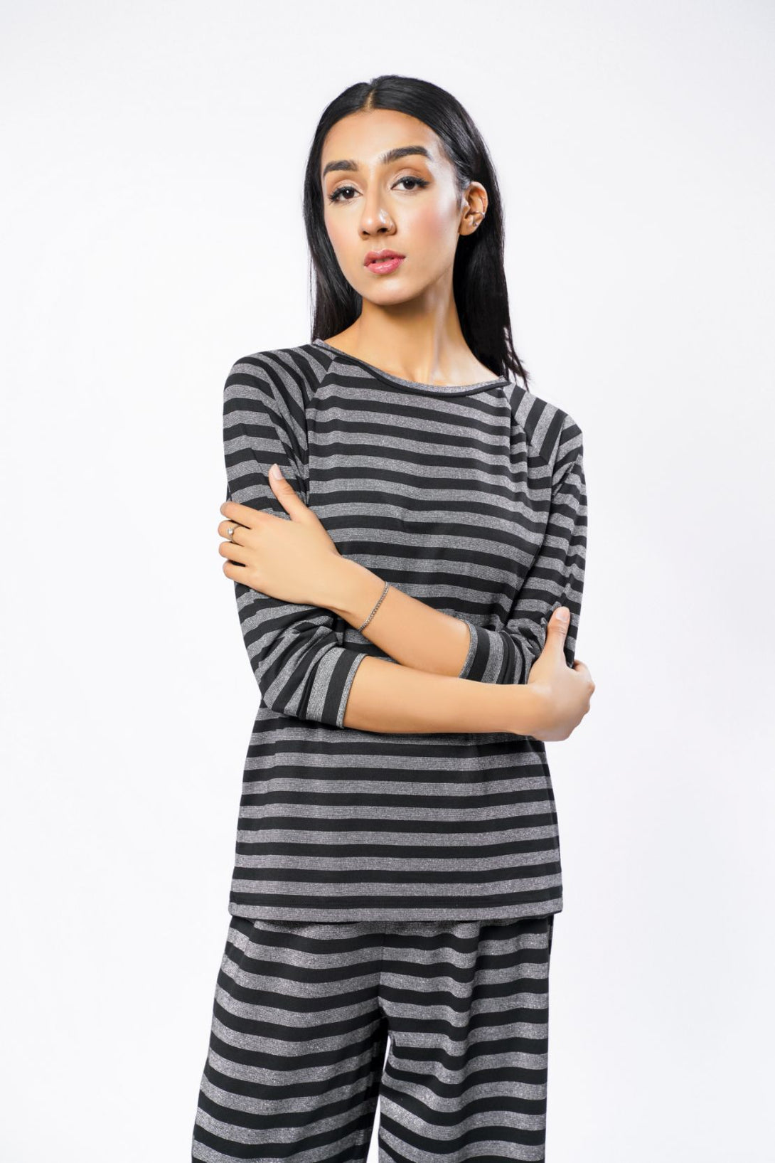 Our Black Top is crafted from high-quality knitted jersey for a soft and comfortable fit. It features a silver stripe design and a crew neckline for an elevated look. The breathable fabric is perfect for an active lifestyle.