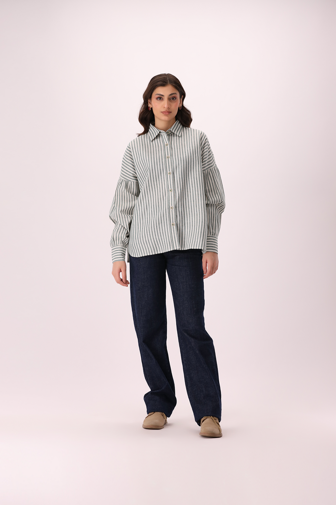 Made with high-quality cotton, This Button Down Striped  Shirt is a classic and versatile wardrobe staple. Its timeless design featuring stripes and a button-down front makes it easy to style for both casual and more polished looks. The volume at the sleeves adds a unique touch. Elevate your everyday style effortlessly with the Button Down Striped Shirt.