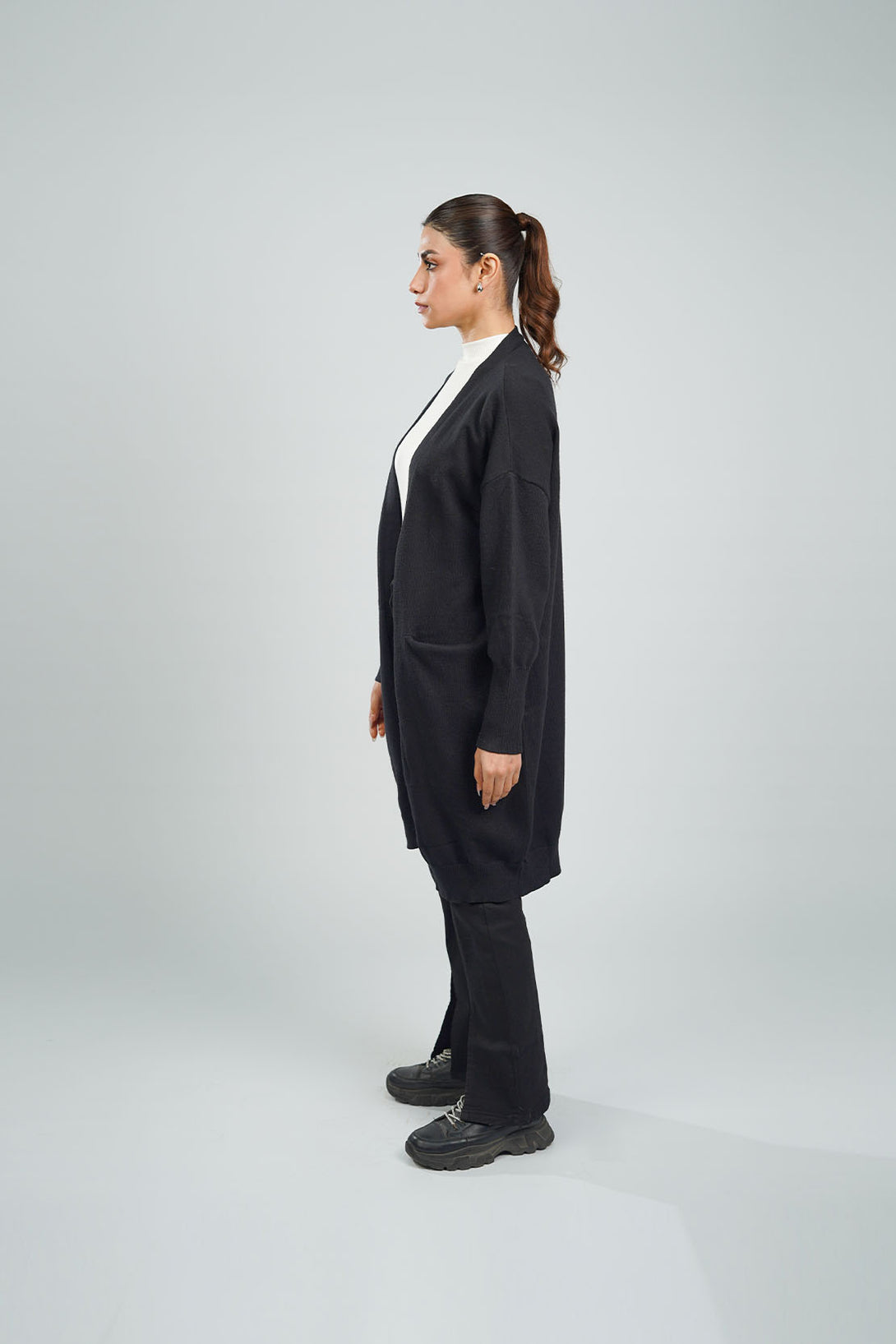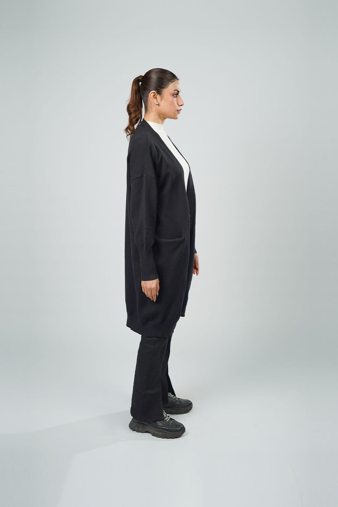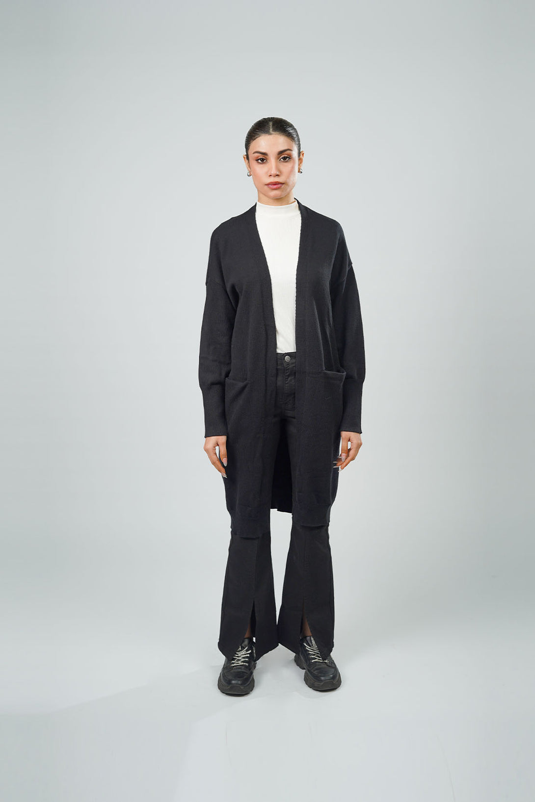 This long acrylic knit cardigan features a front-open design and practical pockets, offering both style and comfort. Its relaxed fit makes it perfect for layering over any outfit.