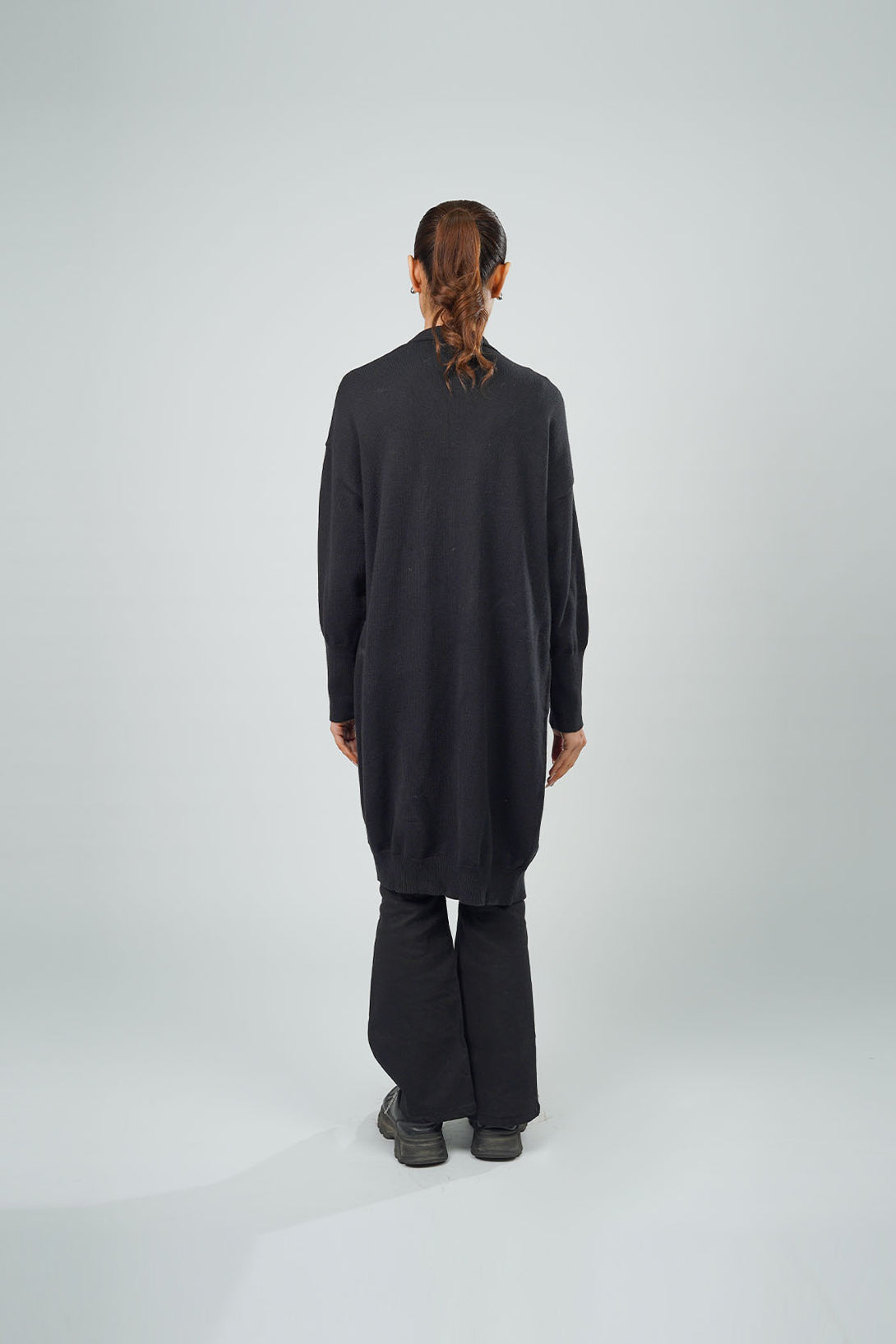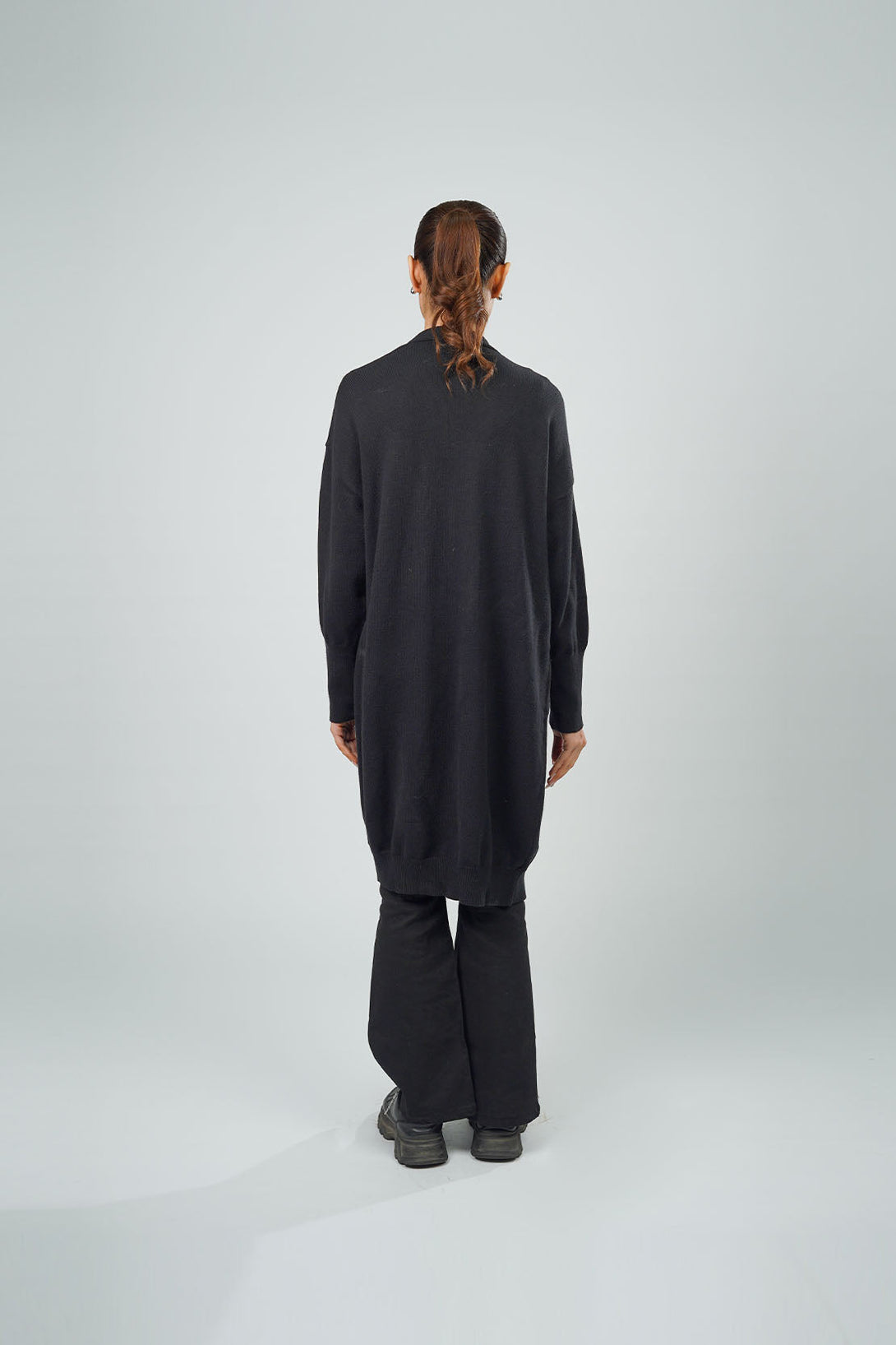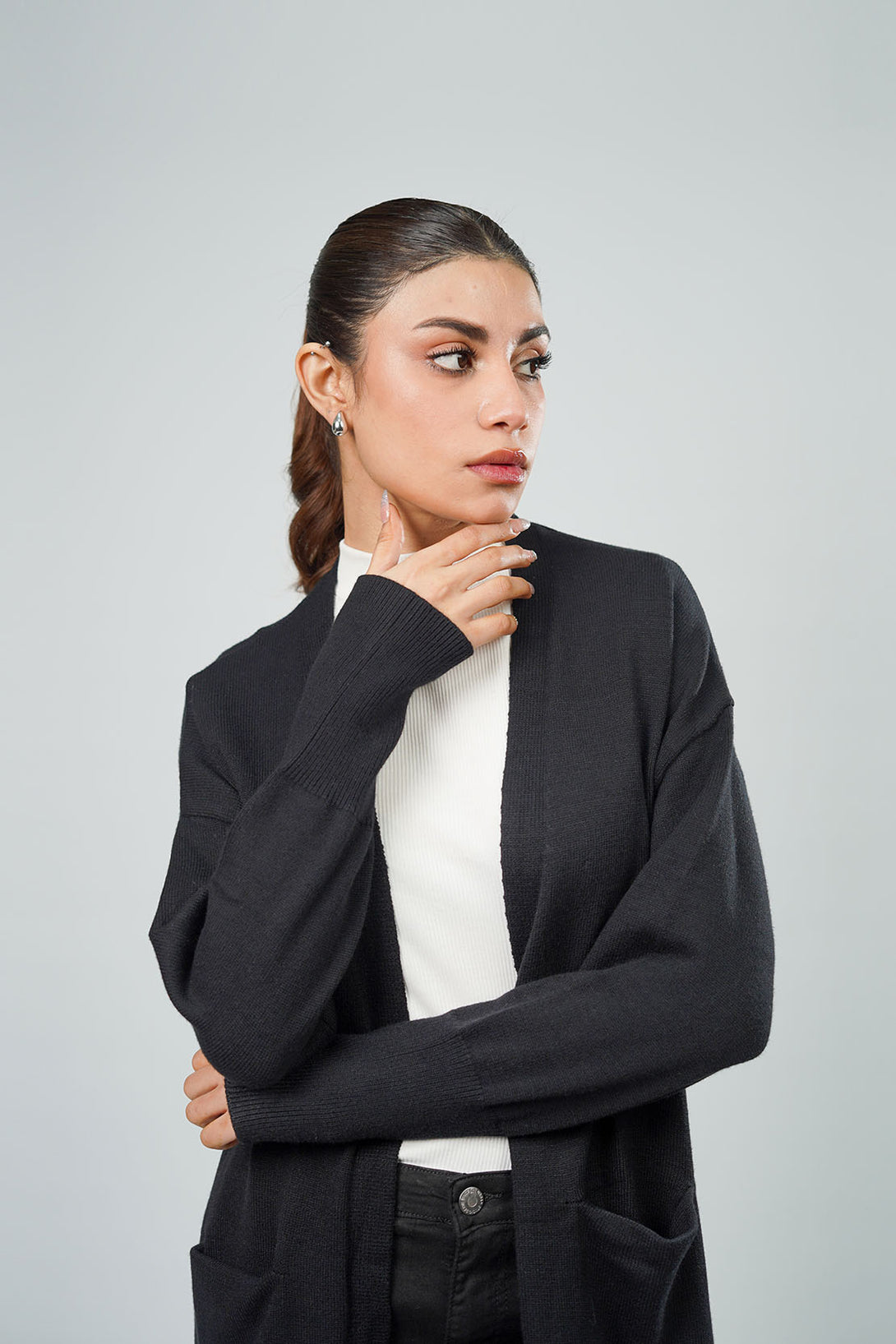 This long acrylic knit cardigan features a front-open design and practical pockets, offering both style and comfort. Its relaxed fit makes it perfect for layering over any outfit.