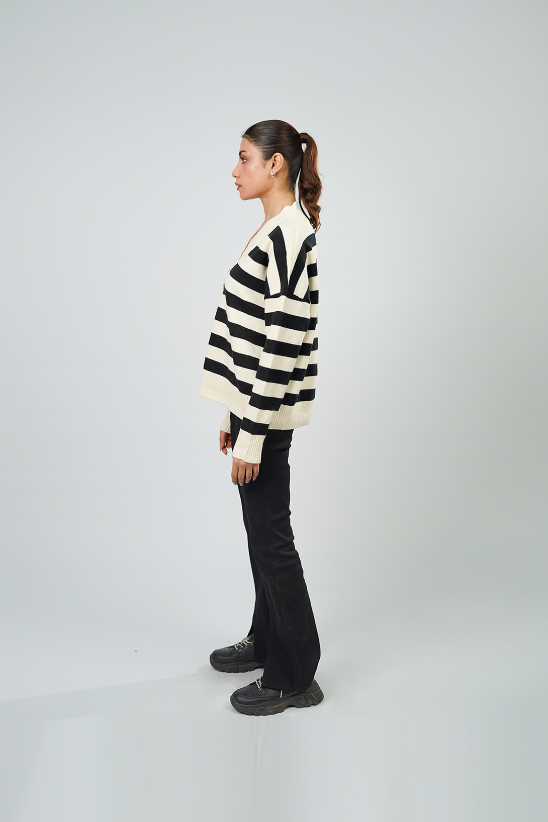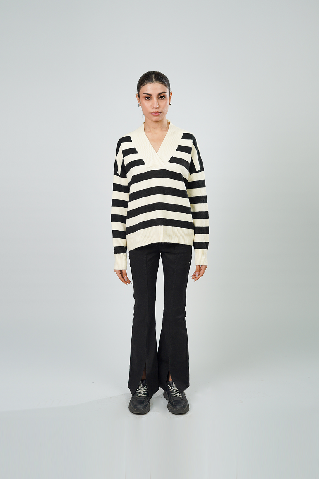 This striped V-neck pullover sweater offers a relaxed, stylish look with drop shoulders and long sleeves. Made of high-quality acrylic fabric, the ribbed detailing around the cuffs and hem adds texture and structure, while the striped pattern brings a bold, fashionable touch.