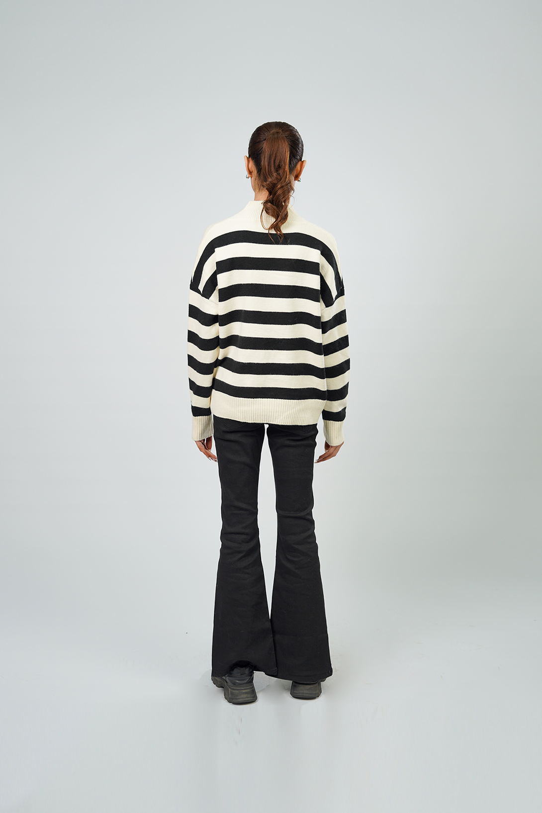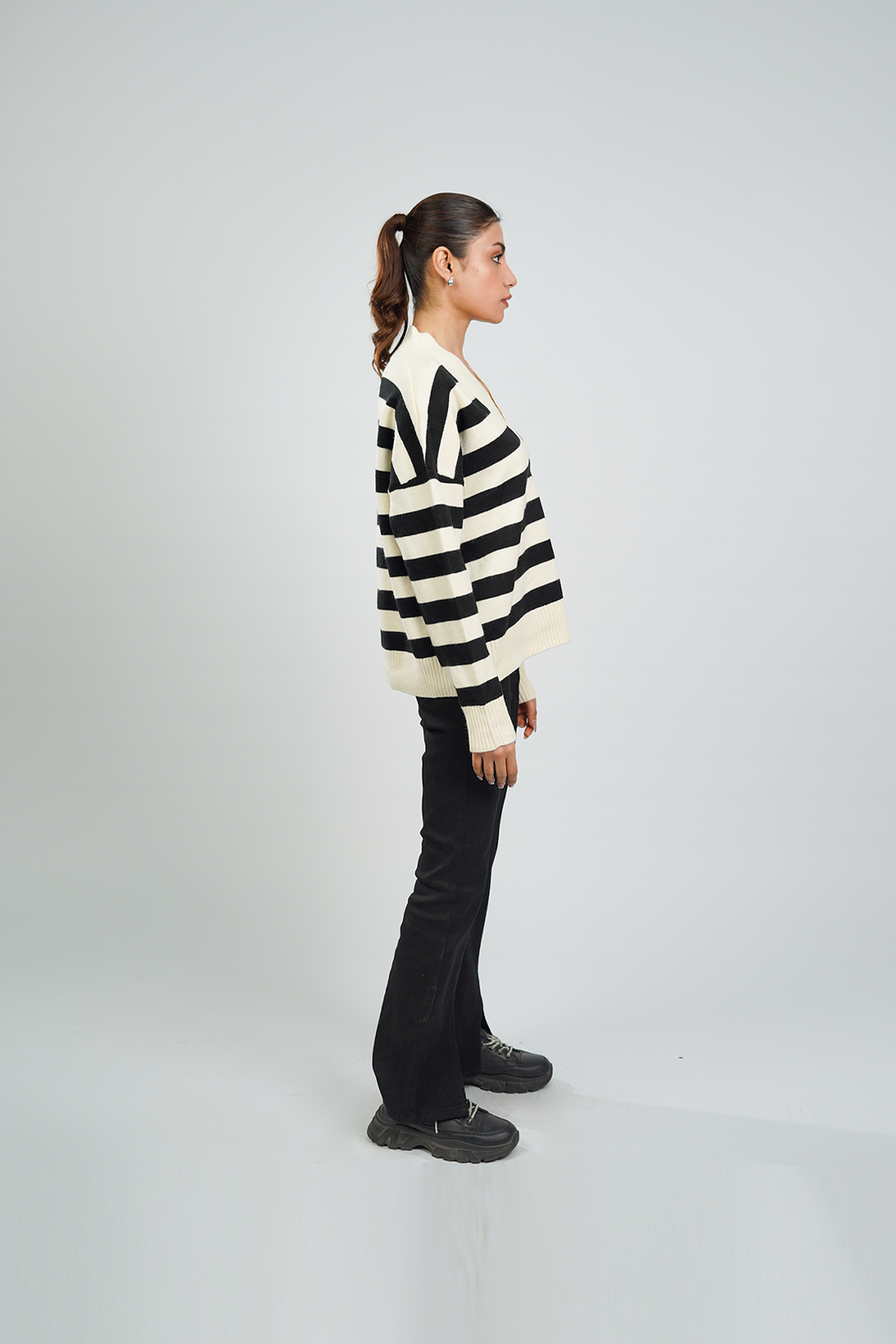 This striped V-neck pullover sweater offers a relaxed, stylish look with drop shoulders and long sleeves.  Made of high-quality acrylic fabric, the ribbed detailing around the cuffs and hem adds texture and structure, while the striped pattern brings a bold, fashionable touch.