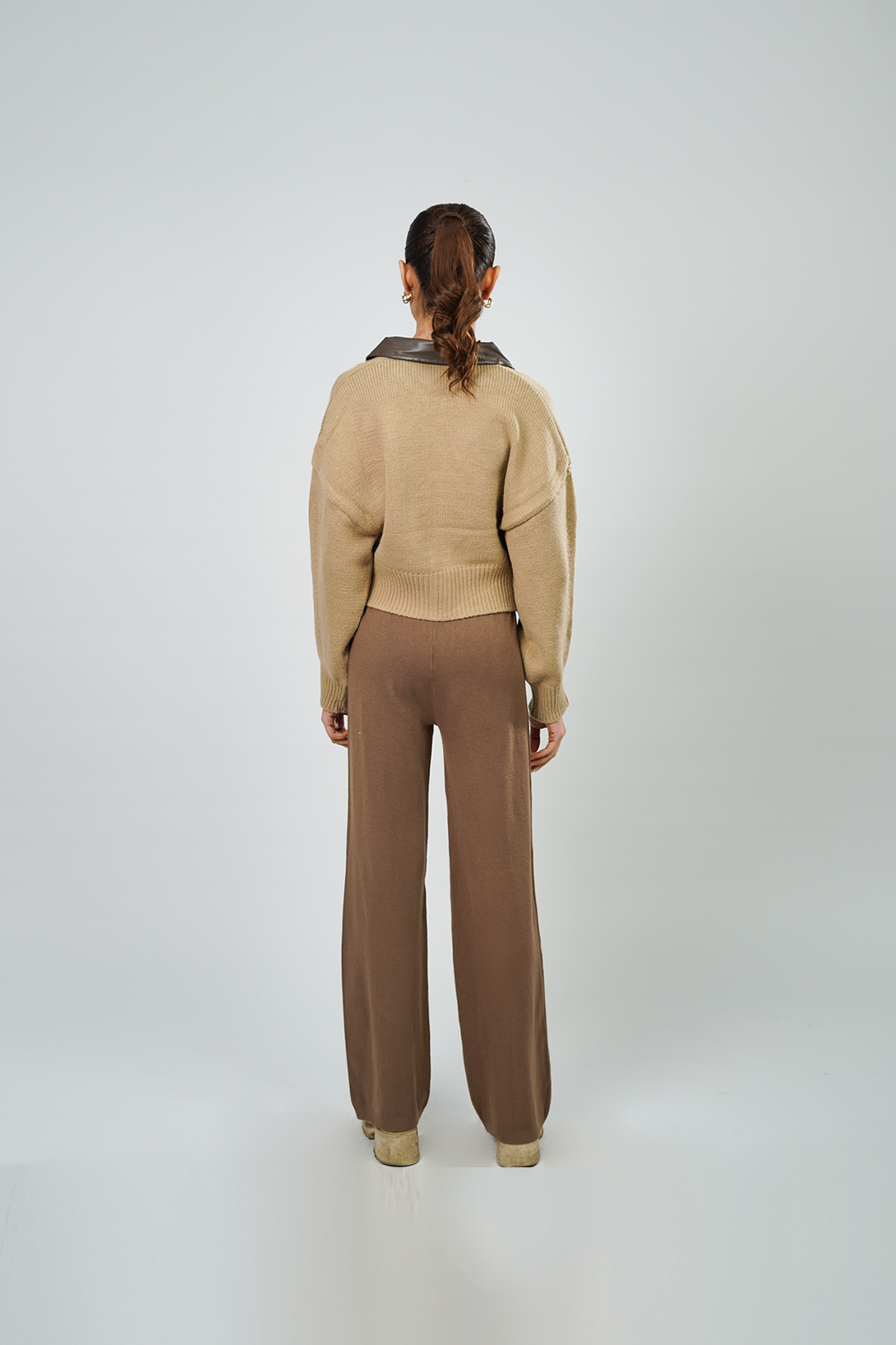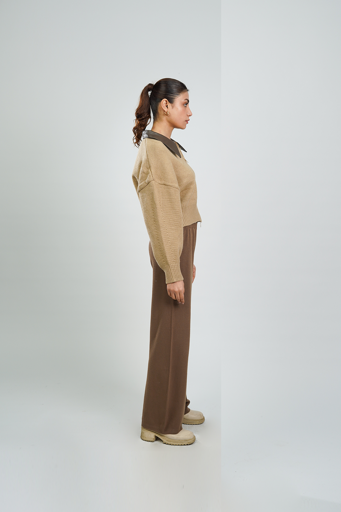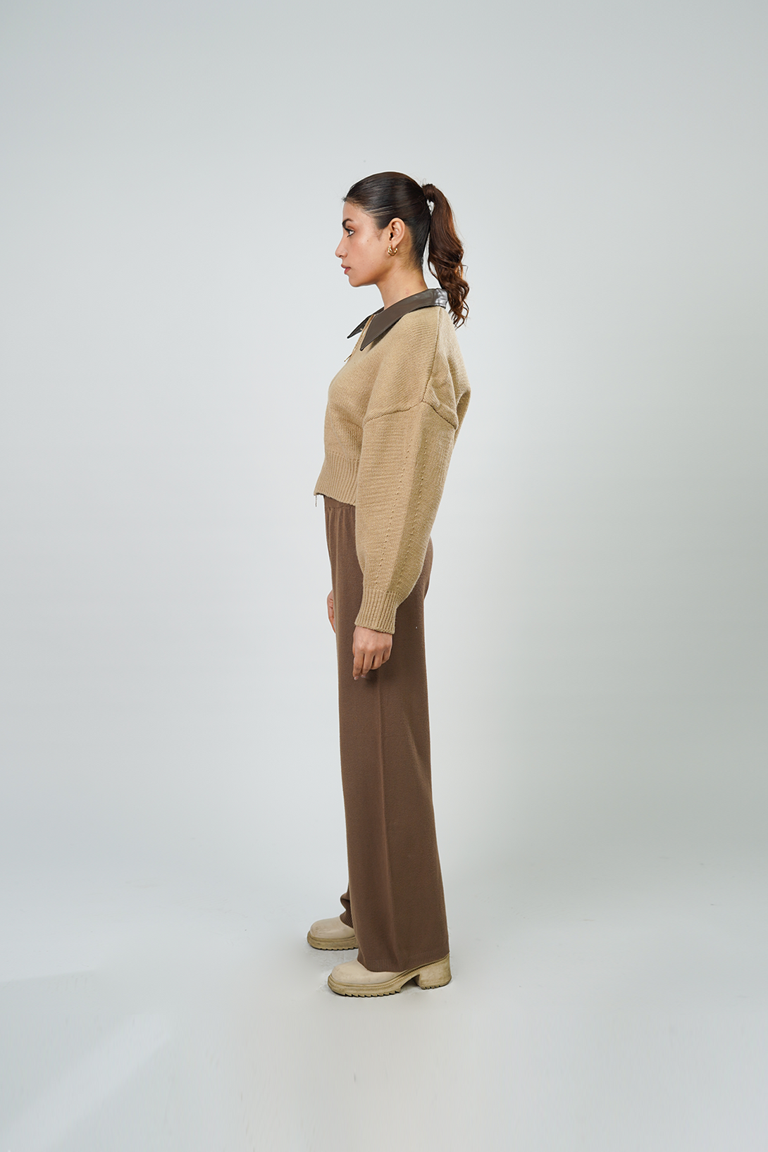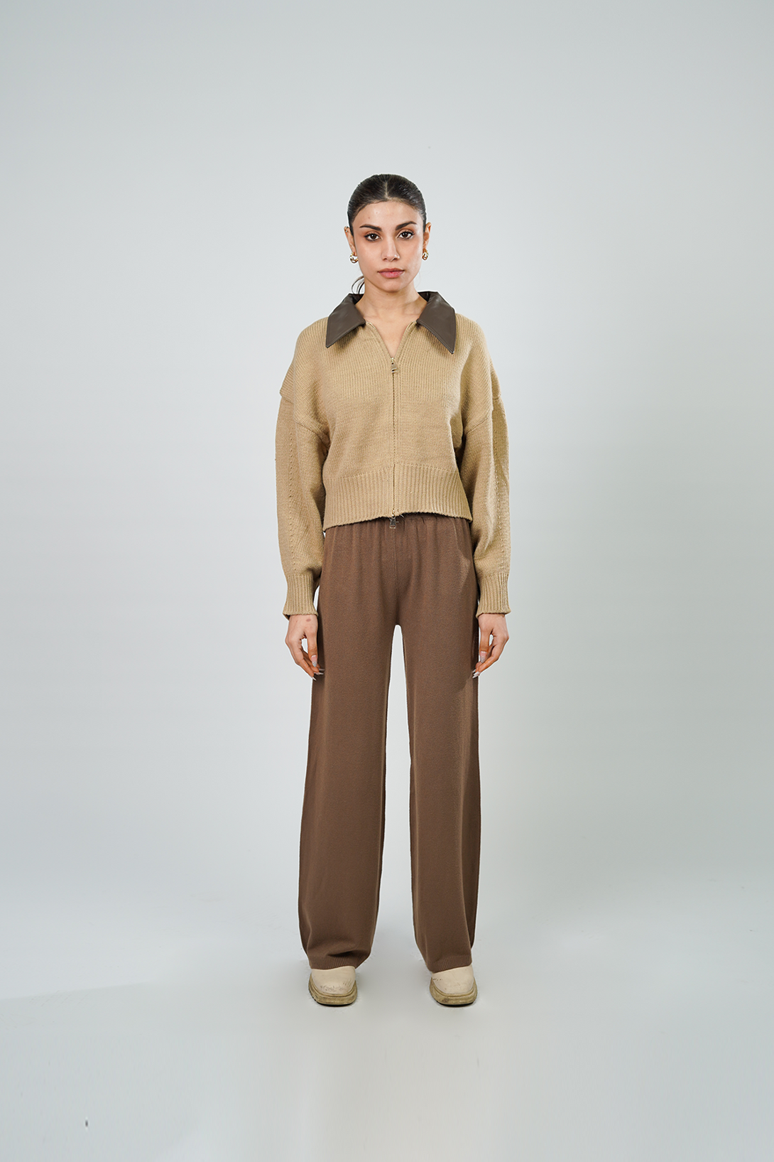 This acrylic knit crop cardigan features a bold front double zip-up closure and a sleek leather collar for a modern, edgy look. Perfect for adding a stylish twist to your outfit, it’s both trendy and versatile, offering a flattering cropped fit that pairs well with a variety of styles.