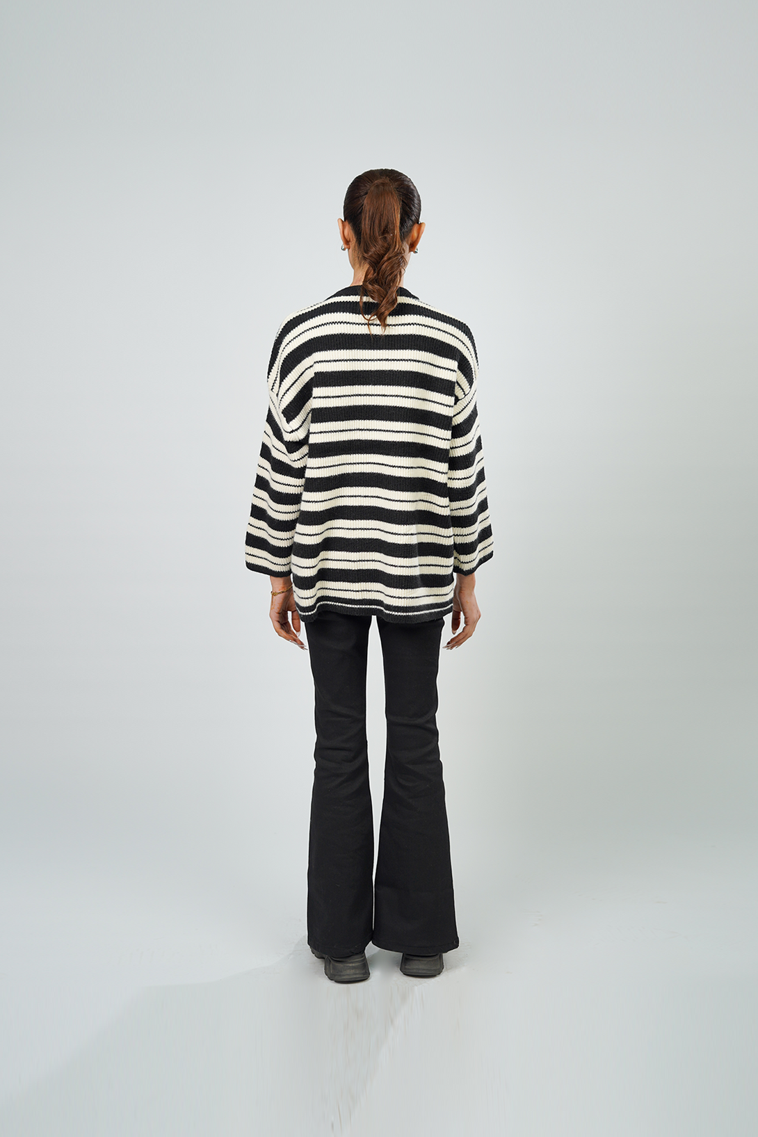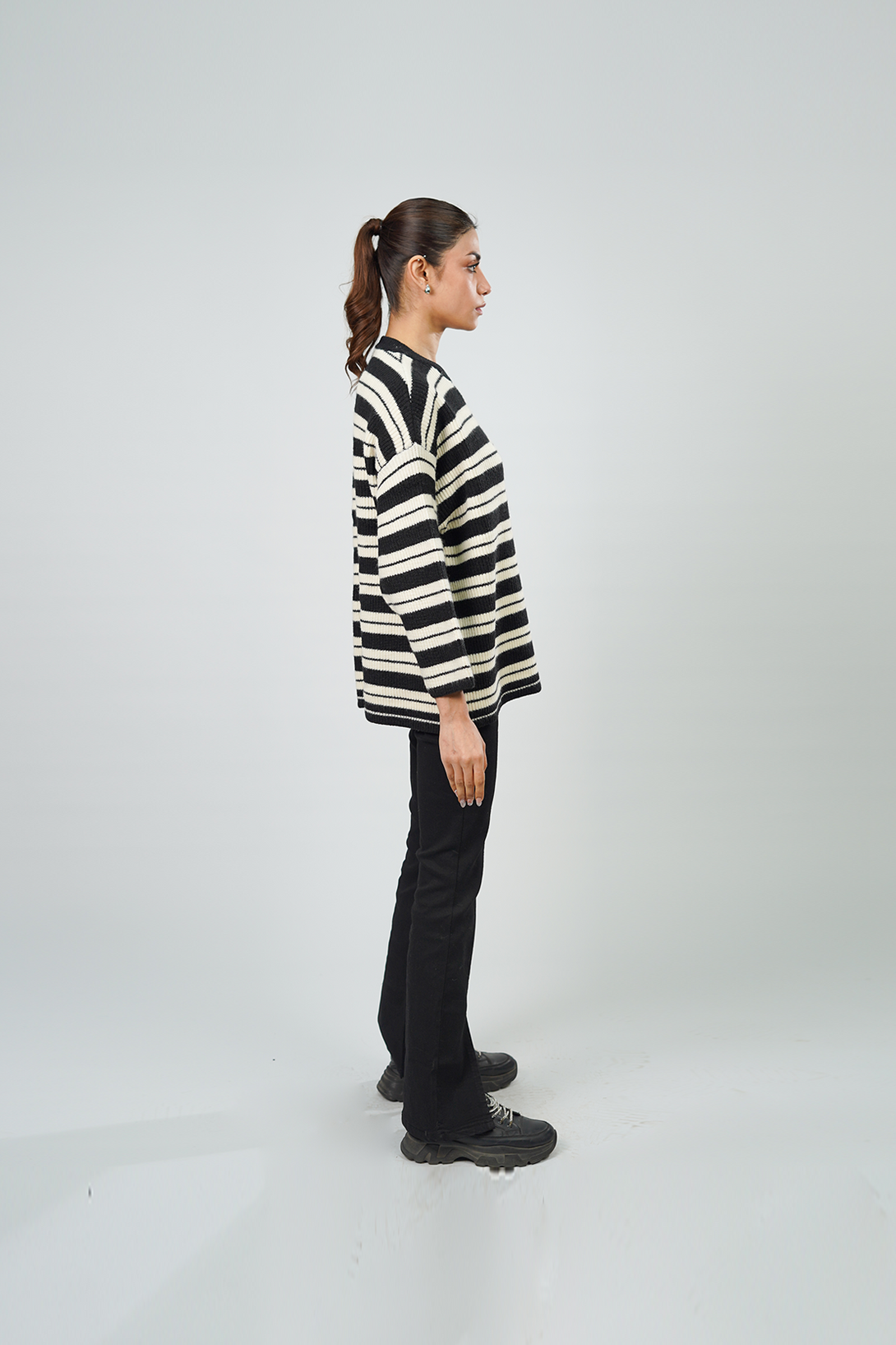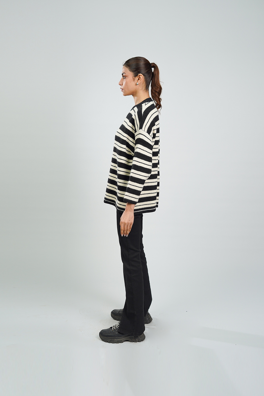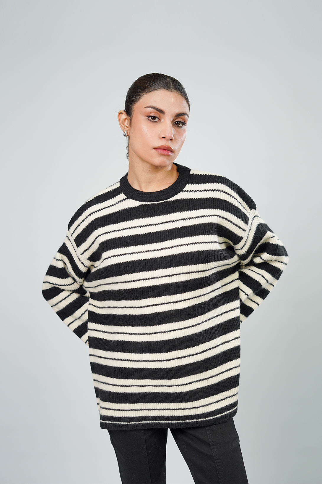 This relaxed-fit pullover sweater made of high-quality acrylic fabric features a loose knit design with a striped pattern that brings a stylish touch to your look. With its classic round neck and ribbed detailing at the neckline, it has a timeless vibe. Stay comfortable with this versatile Ladies Sweater