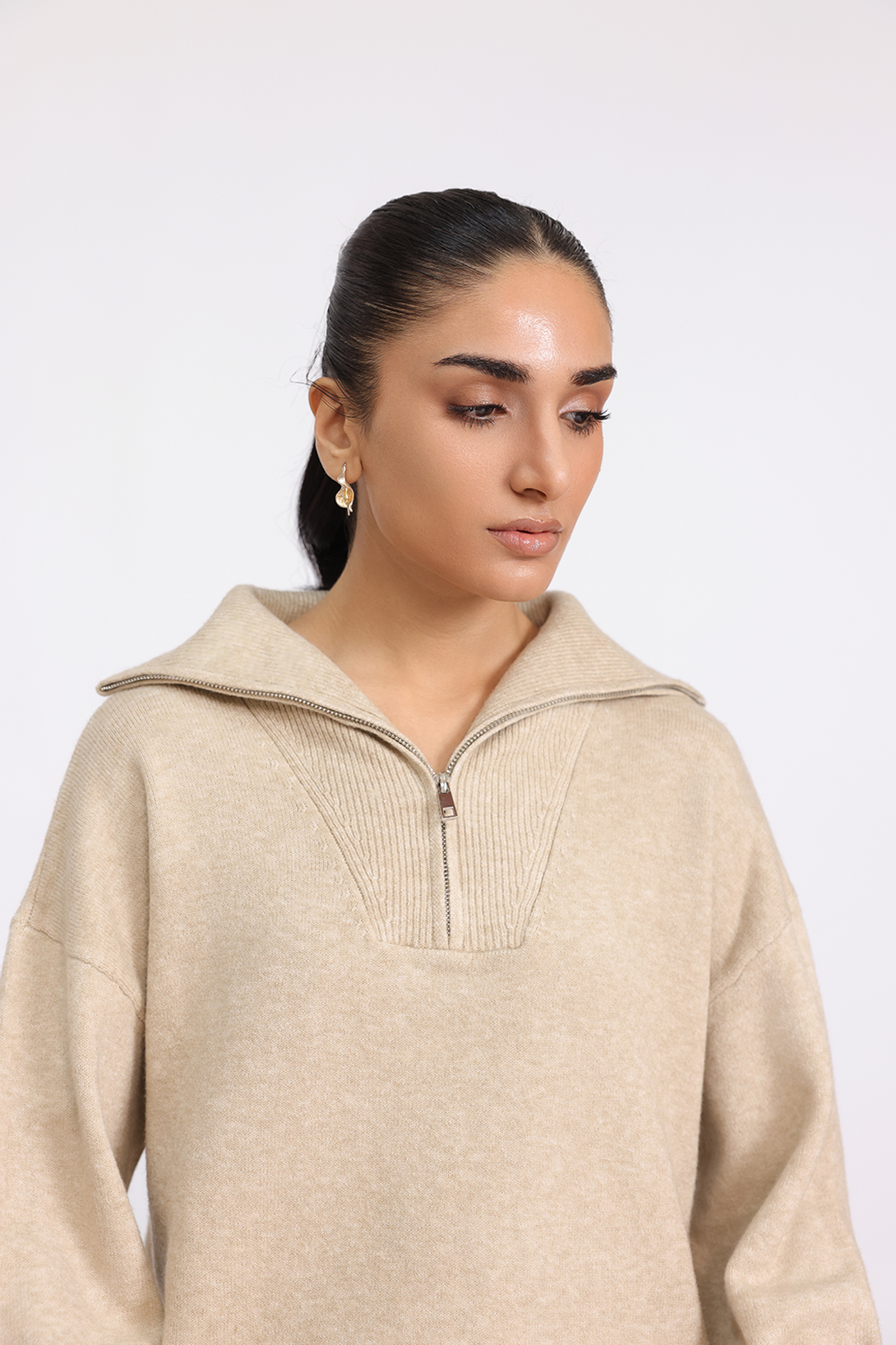 Elevate your casual wardrobe with this relaxed-fit acrylic sweater. Featuring a high neck with an oversized collar, partial zip fastening, and drop shoulders for effortless style and comfort.